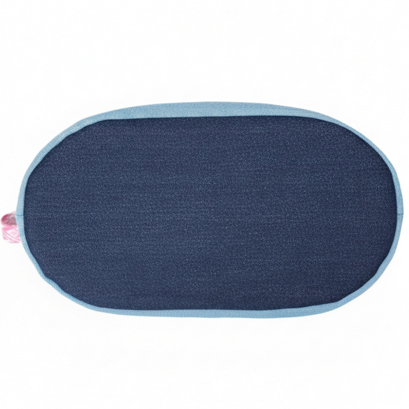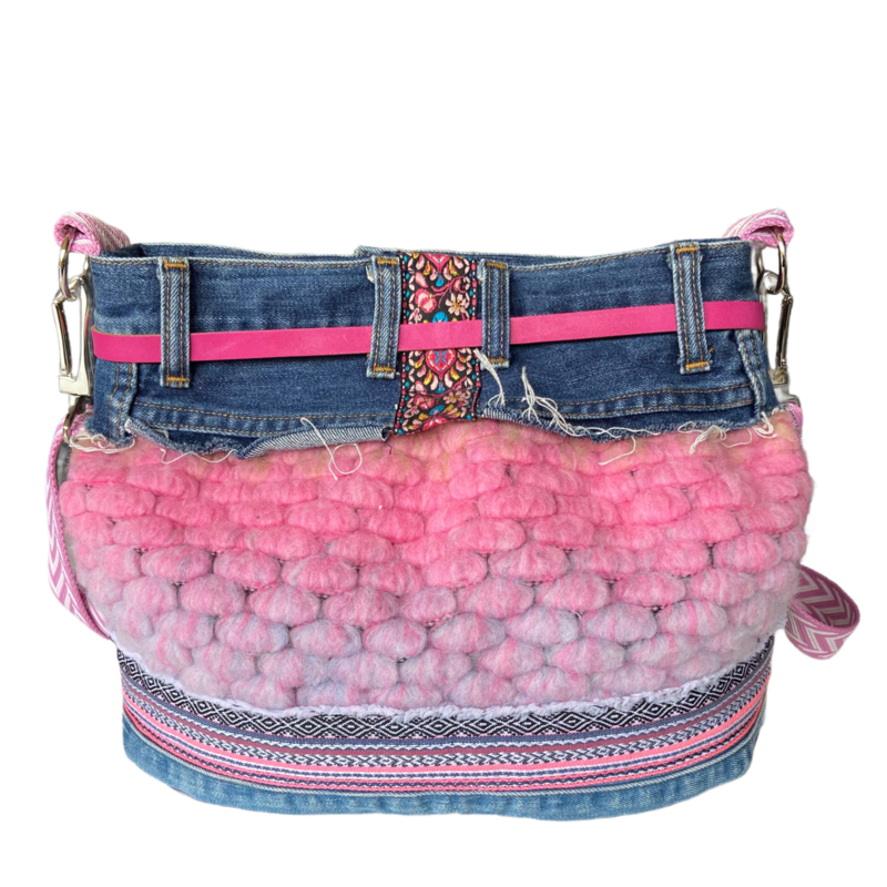Made from the upper part of a recycled pair of jeans, making this bag truly unique. The bold combination of rugged denim and soft plush fur-like material in vibrant pink creates a playful yet luxurious look.