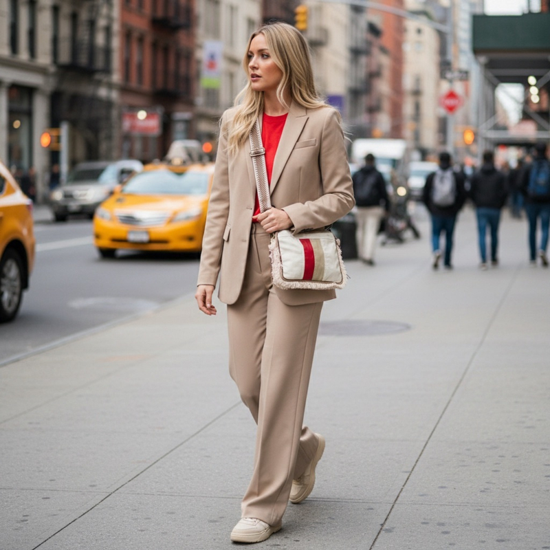 SKU: T0035AThis unique crossbody bag is made from recycled leather and denim in cream and red. The front of this special shoulder bag is made from the leather of an old jacket in cream, beige, and red. The sides and bottom feature a striped ribbon and short cream-colored fringe. The back is made from used denim with the text "Houston challenges" in red and white letters and a trendy trim. The bag securely closes with a zipper and has an adjustable shoulder strap with bronze-colored hooks. A string with beads and bronze-colored charms and a wooden heart hangs on the side.
